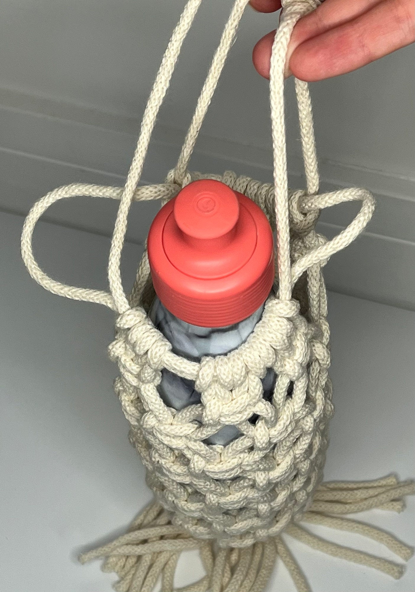 The drawstring top makes it secure to hold your bottle and the carabiner clip included helps to clip it to your bag, pushchair or work out mat, just like the yoga mat straps you can find on my website.